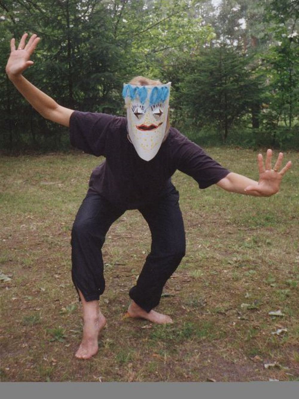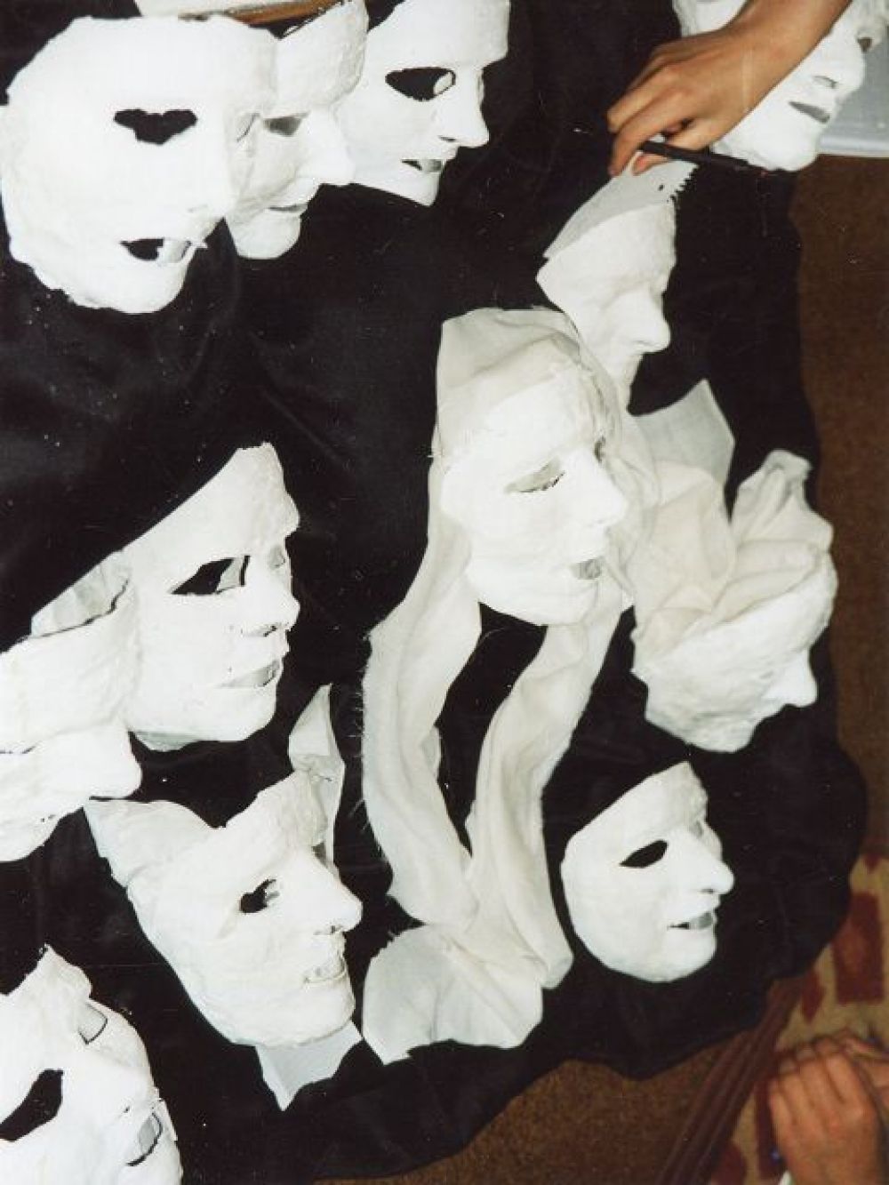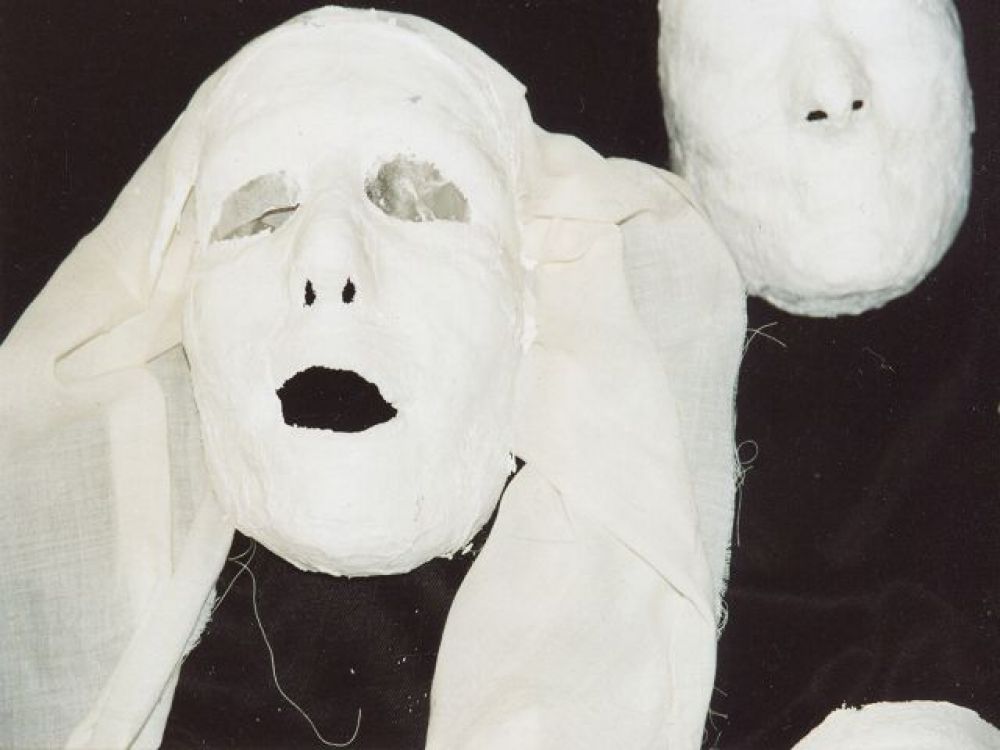Masken aus Papier, Pappmache‘ oder Gips werden angefertigt. Die SpielerInnen mit der Maske können die örtlichen Gegebenheiten nutzen, Rollenbiographien anfertigen, Dialoge entwickeln in der Improvisation oder aus der Textproduktion heraus.
