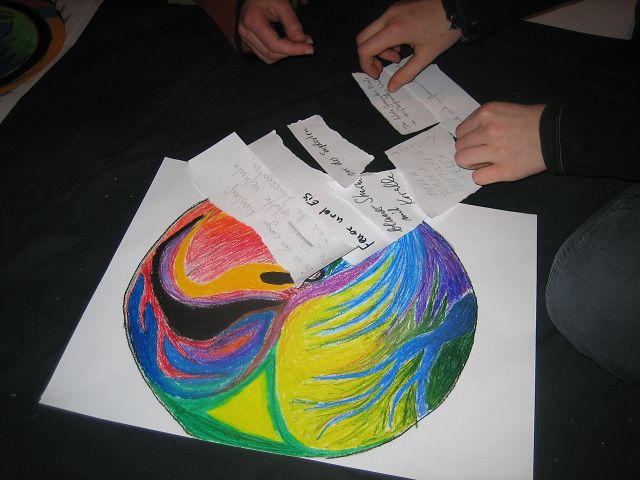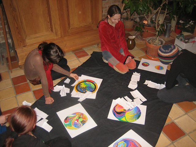 Es wird zuerst über das geredet, was halb fertig ist oder was man neues schreiben oder zeichnen könnte, … Wenn alles ausgetauscht ist, verstreuen sich die Schreiberlinge über die ganze Wohnung.